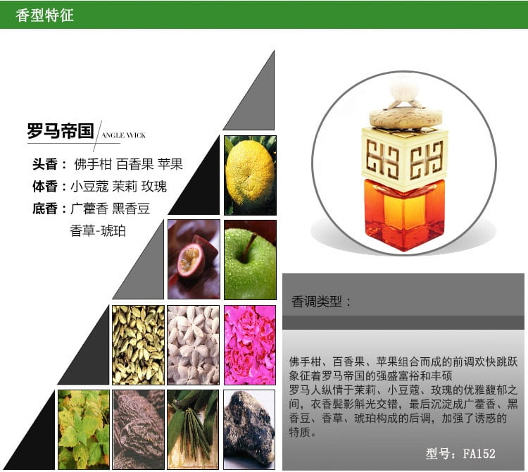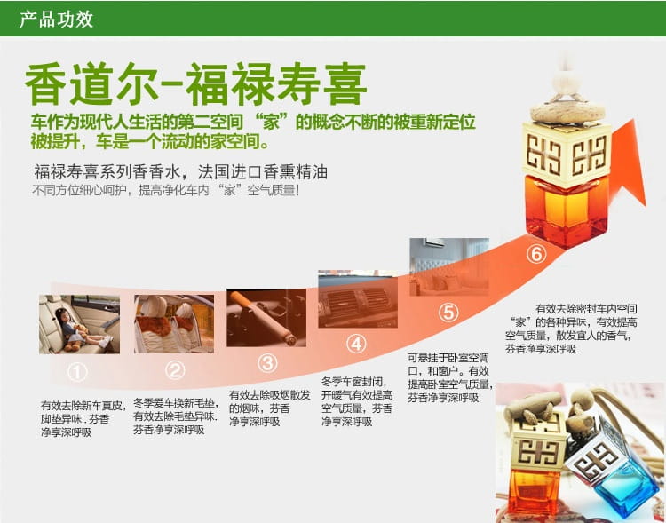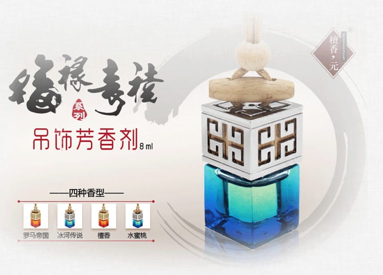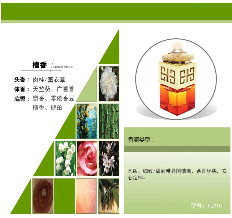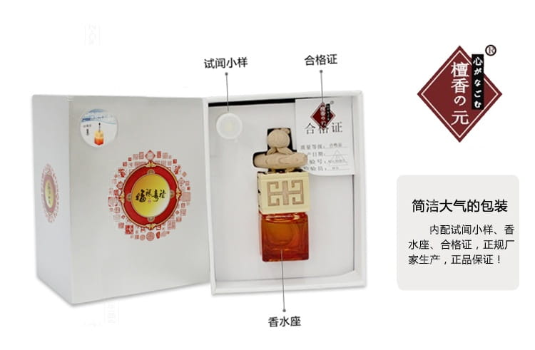 心靈療效:放松效果絕佳,可安撫神經緊張及焦慮,鎮靜的效果多于振奮。并且,用檀香以改善執迷的狀態,極獲好評,可以帶給使用者更為祥和、平靜的感覺。 駕馭時尚:愛車陪伴著尊貴車主挑戰激情和邁向成功。檀香之元提煉當今成功人士最珍愛的時尚概念,配合健康淡雅的香味和經典的外觀,全力創造嗅覺和視覺雙品味駕駛空間。精選的香料、神秘的調配營造了香氣的天堂。出自設計名家的外觀和結構,簡約中對細節的雕琢體現了智慧、務實的高貴時尚理念。駕馭朗龍,駕馭時尚!